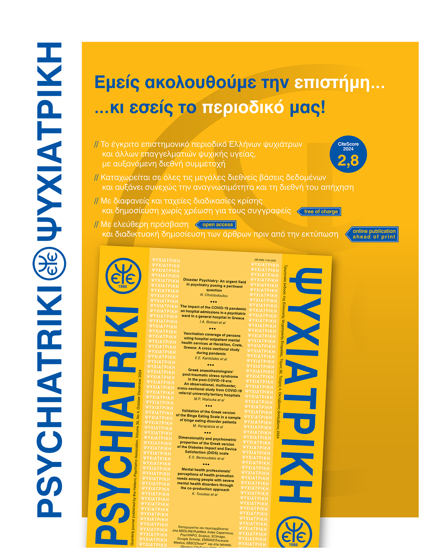 H Ψυχιατρική είναι το επίσημο επιστημονικό περιοδικό της Ελληνικής Ψυχιατρικής Εταιρείας.